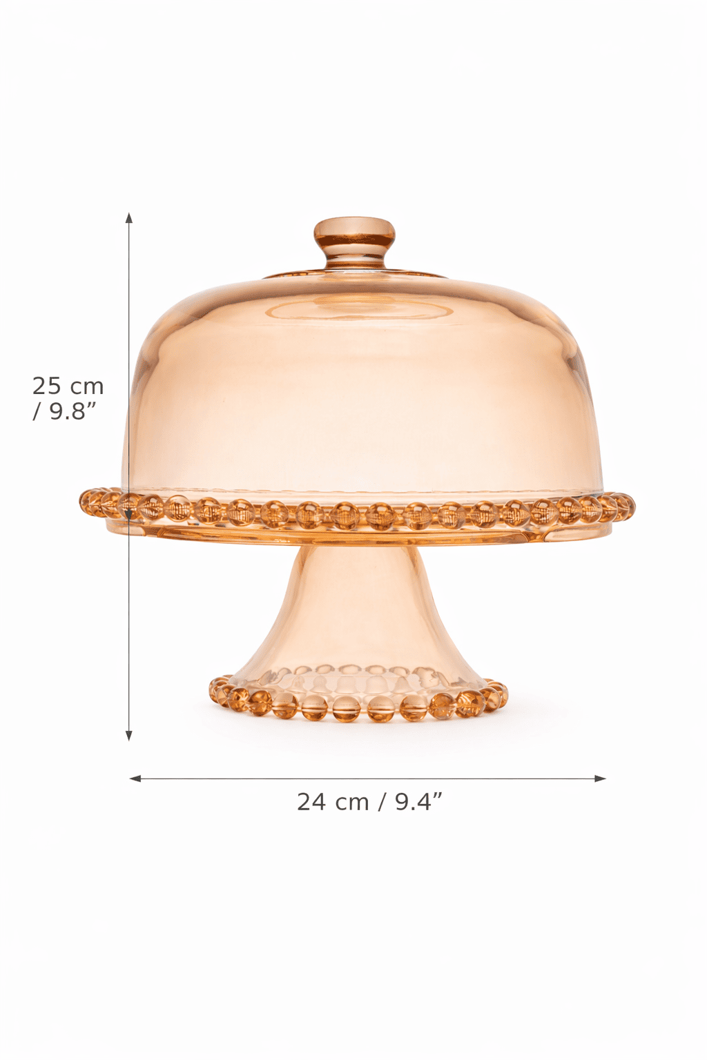 • Elegant amber-tinted glass cake stand with matching dome