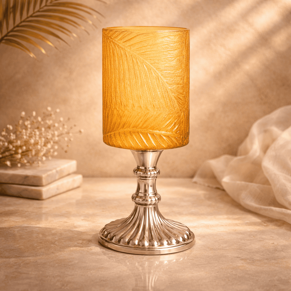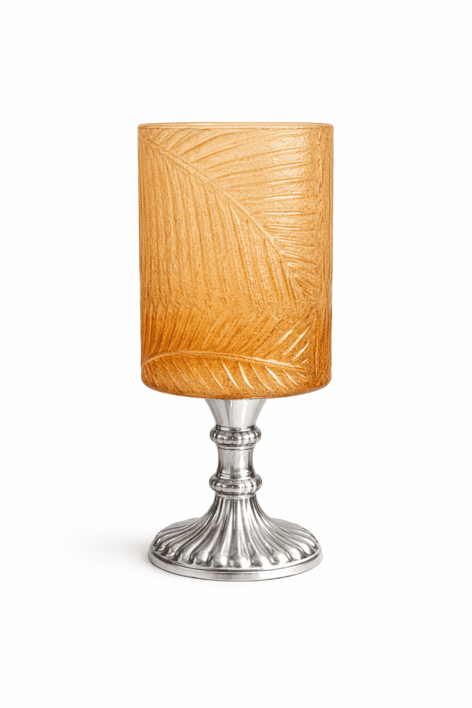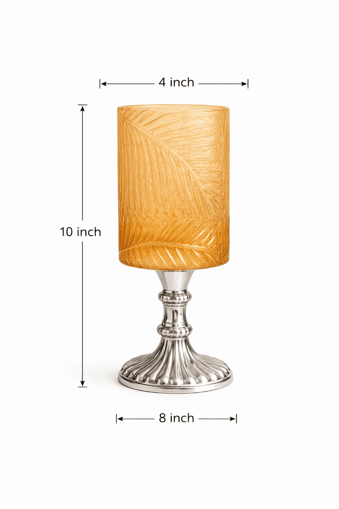 Add warmth and elegance to your décor with this beautifully designed amber leaf pattern glass hurricane. The cylindrical glass features an intricate leaf texture that enhances the glow of candles, creating a soft and inviting ambiance. Paired with a decorative silver pedestal base, this piece blends modern style with classic charm, making it a perfect décor accent for homes and events.