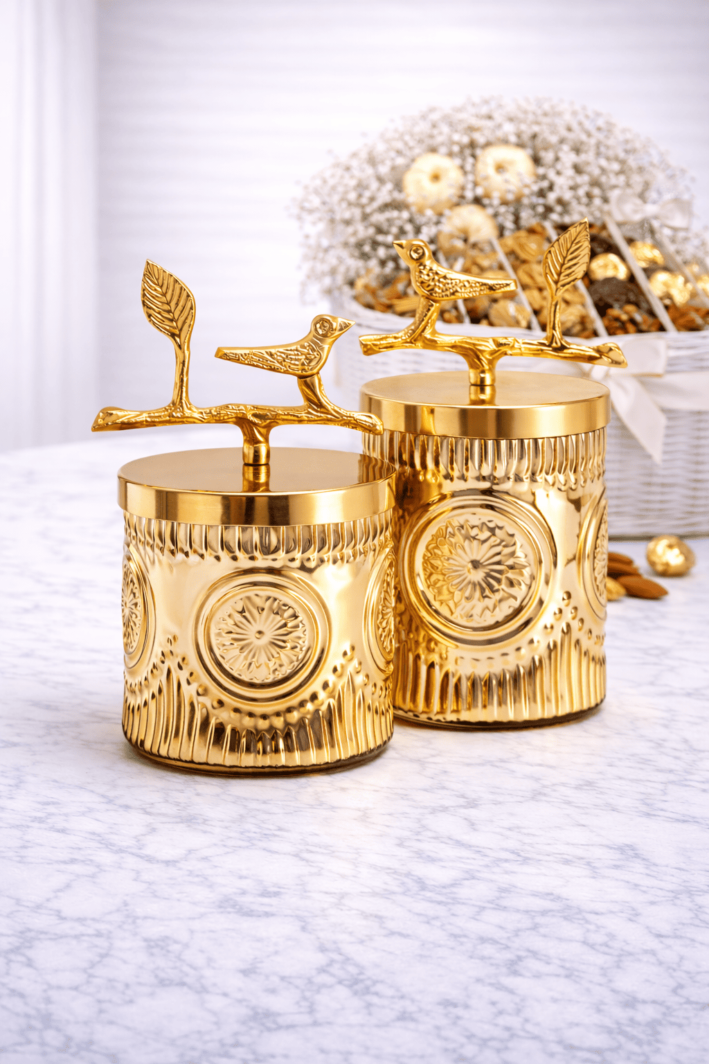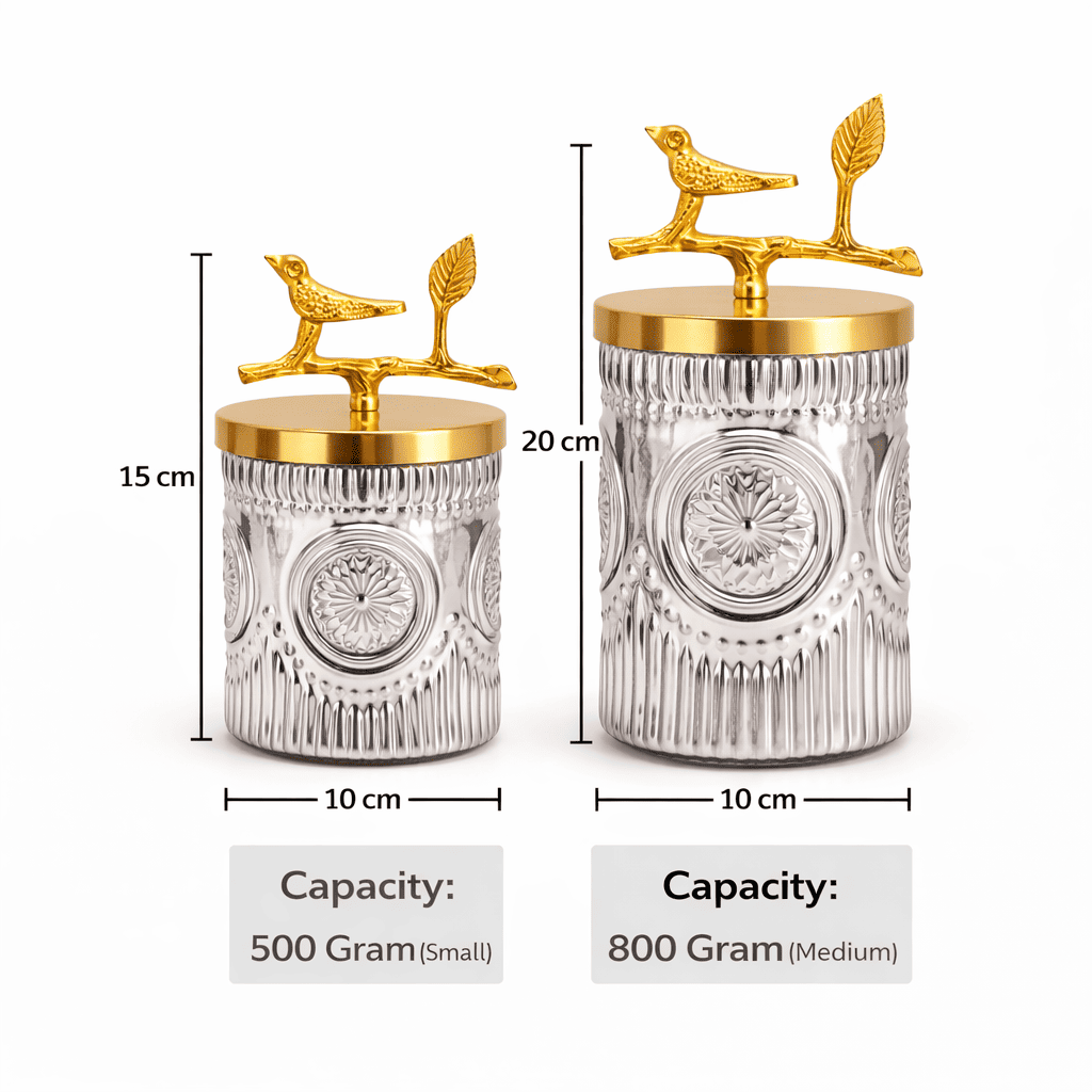 The Bird Lid Glass Hamper Jar by The Castle Crafts is a beautifully crafted decorative jar designed for premium gift hampers and festive packaging. This elegant jar features a clear textured glass body with an artistic gold lid topped with a decorative bird and leaf design, adding a luxurious and modern touch.