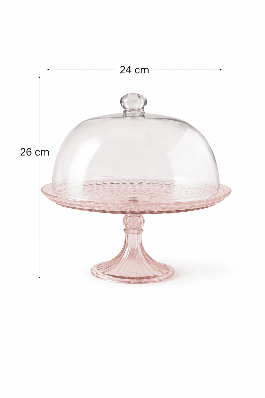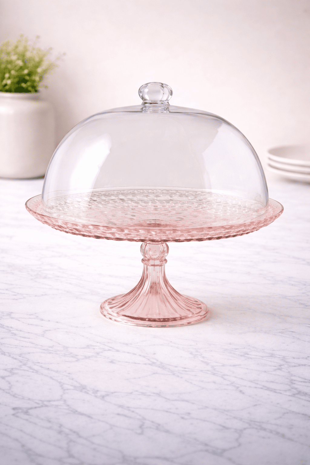 • Elegant blush pink glass pedestal cake stand with clear dome