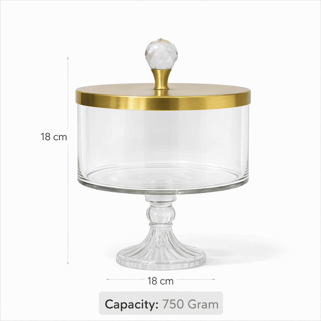 The Crystal Gold Pedestal Hamper Jar by The Castle Crafts is a luxurious decorative jar specially designed for premium gift hampers, dry fruit hampers, chocolate hampers, and festive gifting. The jar features a clear glass body placed on a stylish gold pedestal base, topped with a gold-finish lid and elegant crystal knob that enhances its premium appearance.