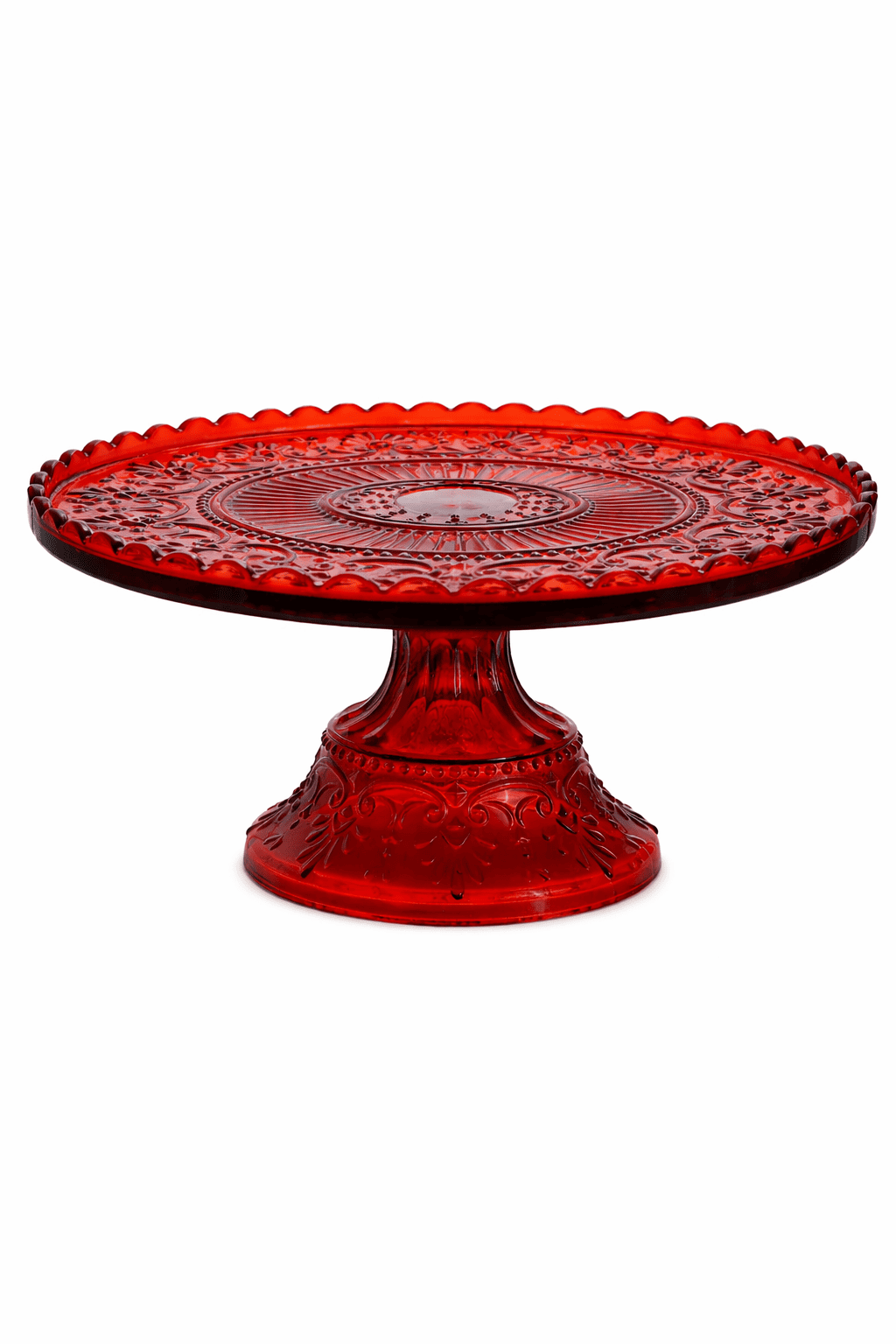 A bold red cake stand crafted for striking presentation.
