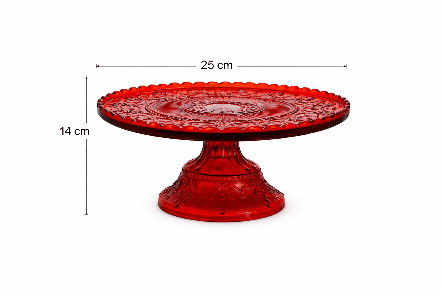 The Castle Crafts Premium Red Embossed Cake Stand (25 cm) is a bold and eye-catching centerpiece designed to make every celebration stand out. Featuring a wide 25 cm diameter top and 14 cm height, this beautifully crafted stand showcases intricate embossed detailing, elegant scalloped edges, and a sturdy decorative pedestal base. The vibrant red finish adds a rich festive charm, making it perfect for weddings, birthdays, festive celebrations, and special event décor. Ideal for displaying cakes, cupcakes, sweets, and decorative arrangements, this stand brings dramatic elegance to any table setting.
