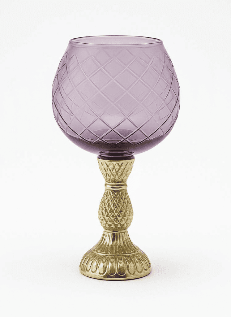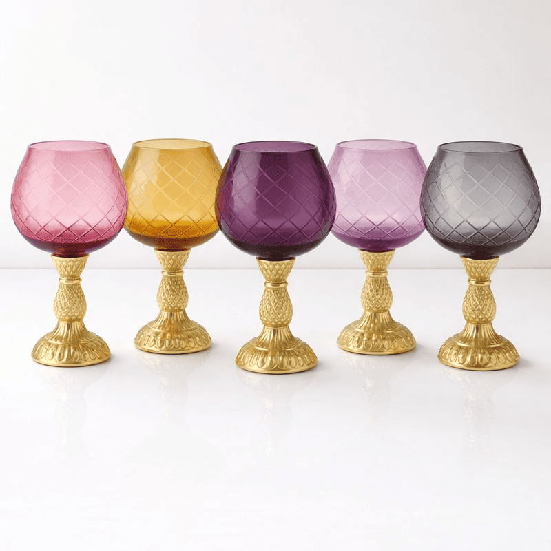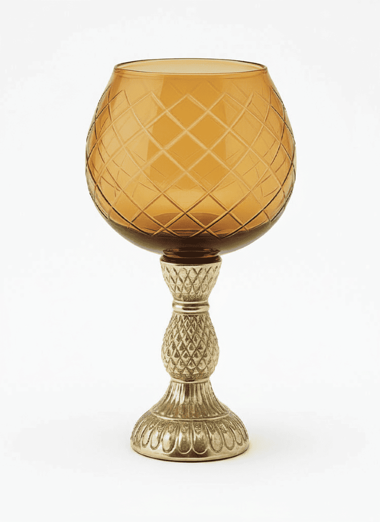Made from high-quality glass and durable metal, the hurricane holder enhances candlelight with its elegant textured glass pattern, creating a warm and ambient glow. The stylish goblet-shaped design combined with the decorative gold base makes it an ideal piece for luxury hamper decoration and premium table styling.