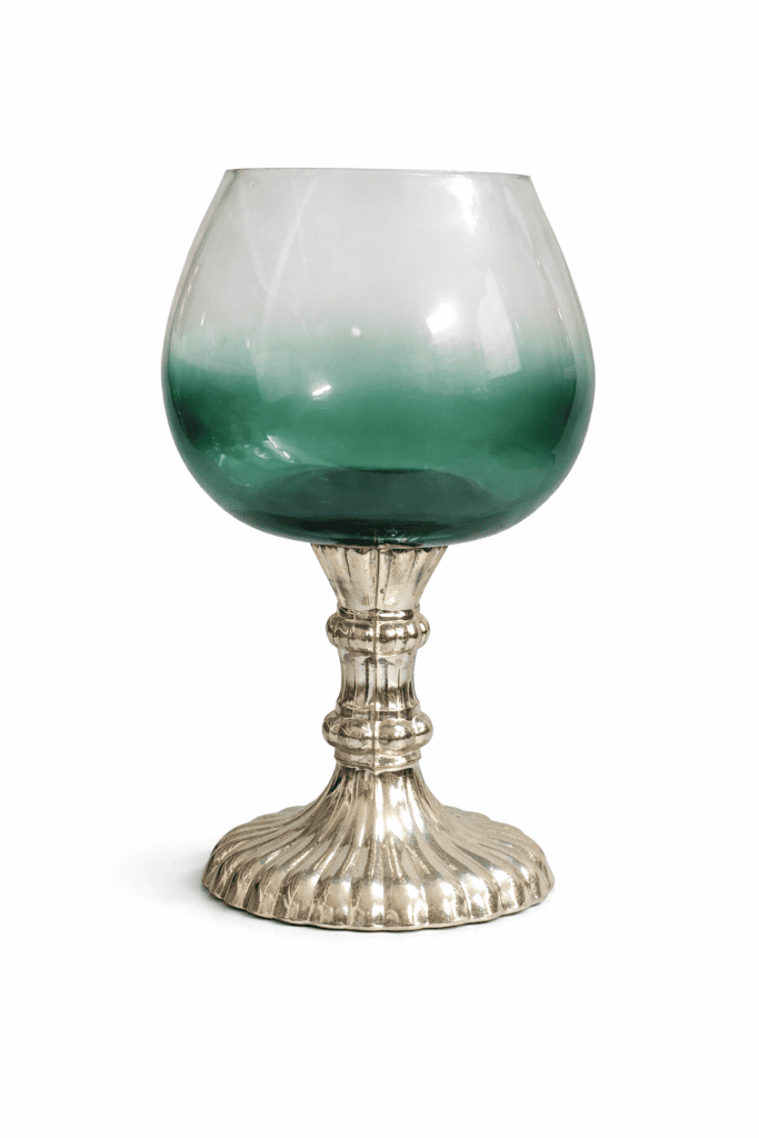 Add a refreshing and elegant accent to your décor with this emerald frost goblet glass holder. The beautifully curved goblet-style glass features a soft frosted white to emerald green gradient that creates a stunning visual effect. Paired with a decorative metallic pedestal base, this piece blends modern elegance with timeless charm, making it a stylish decorative addition to any interior.
