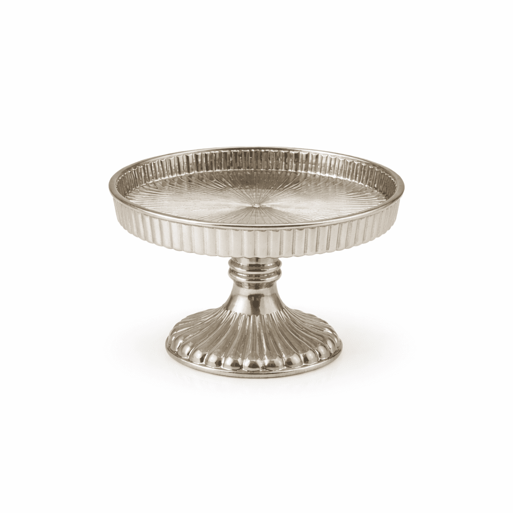 The Castle Crafts Premium Gold Metallic Mini Cake Stand is a compact yet luxurious display piece designed to enhance your dessert presentation and décor styling. Crafted with high-quality material and finished in a rich gold metallic shine, this elegant stand features a 4-inch diameter and 4-inch height, making it perfect for cupcakes, small cakes, sweets, chocolates, and decorative accents. The finely detailed fluted edge and sturdy pedestal base give it a royal appearance, ideal for festive décor, wedding setups, return gifts, and premium hamper presentations.