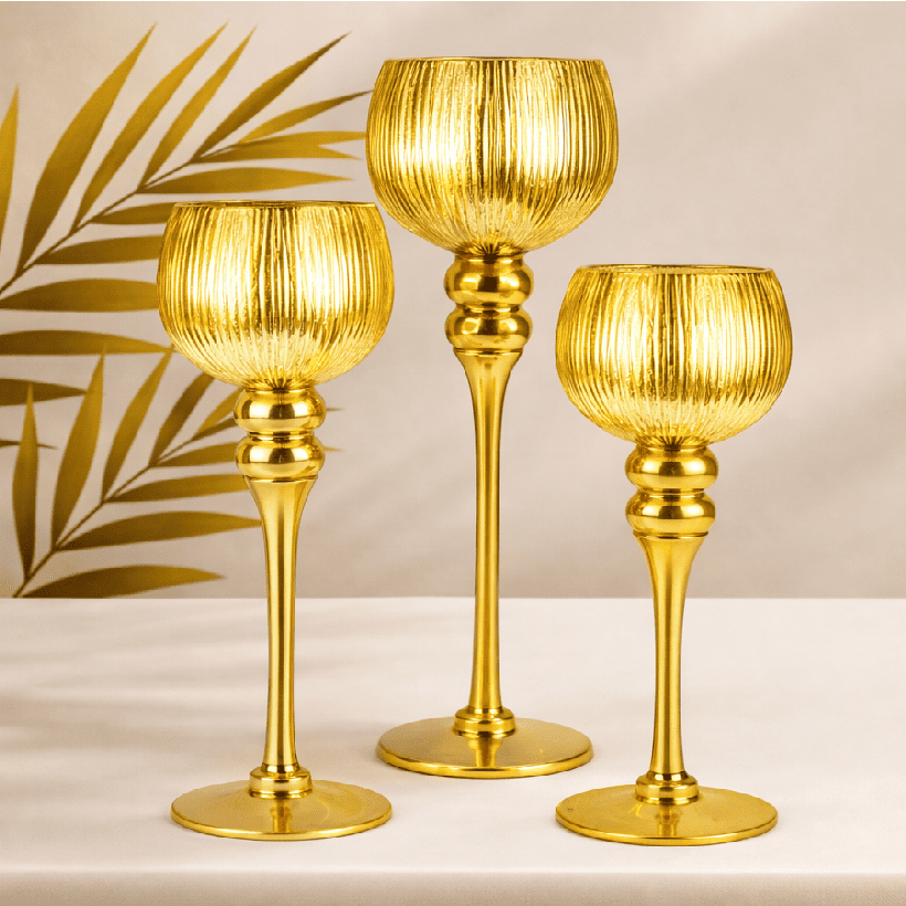 Each piece features a ribbed textured glass bowl paired with a sleek gold metal stand, offering a sophisticated and premium look. The textured glass beautifully reflects candlelight, creating a warm and elegant glow that enhances any decorative arrangement.