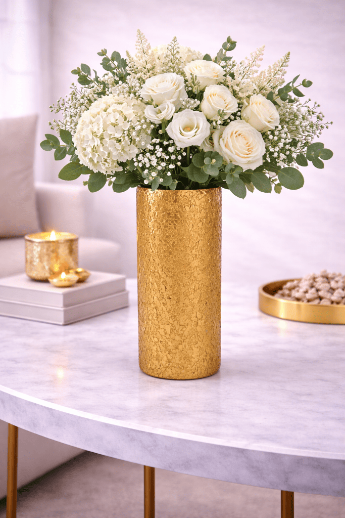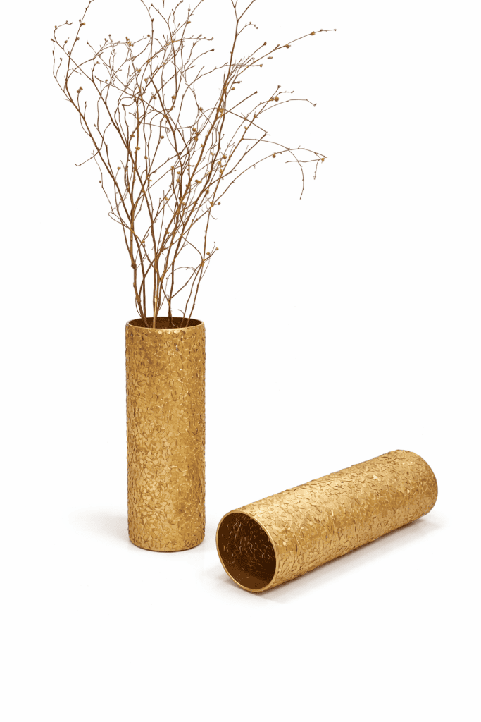 The Gold Textured Cylinder Flower Vase by The Castle Crafts is a stylish and modern decorative vase designed to bring a luxurious touch to any interior setting. Featuring a sleek cylindrical shape with a beautiful gold textured finish, this vase reflects light elegantly and creates a warm decorative glow.
