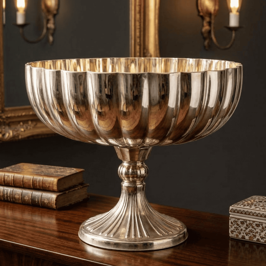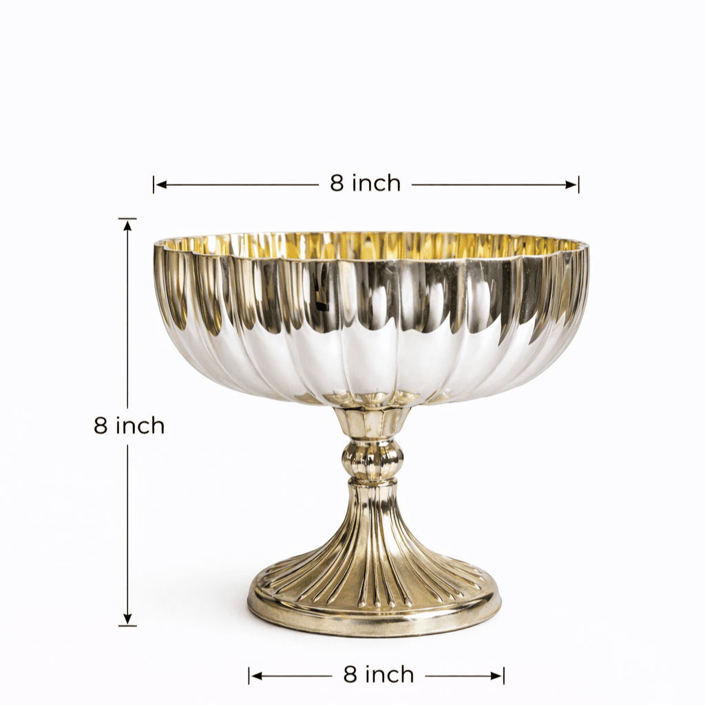 Bring luxury and elegance to your décor with this stunning golden fluted glass centerpiece bowl. Designed with a wide bowl featuring beautiful fluted detailing, this decorative piece reflects light gracefully and creates a rich, sophisticated look. The metallic golden finish paired with a stylish pedestal base makes it a perfect statement centerpiece for modern homes and elegant event décor.