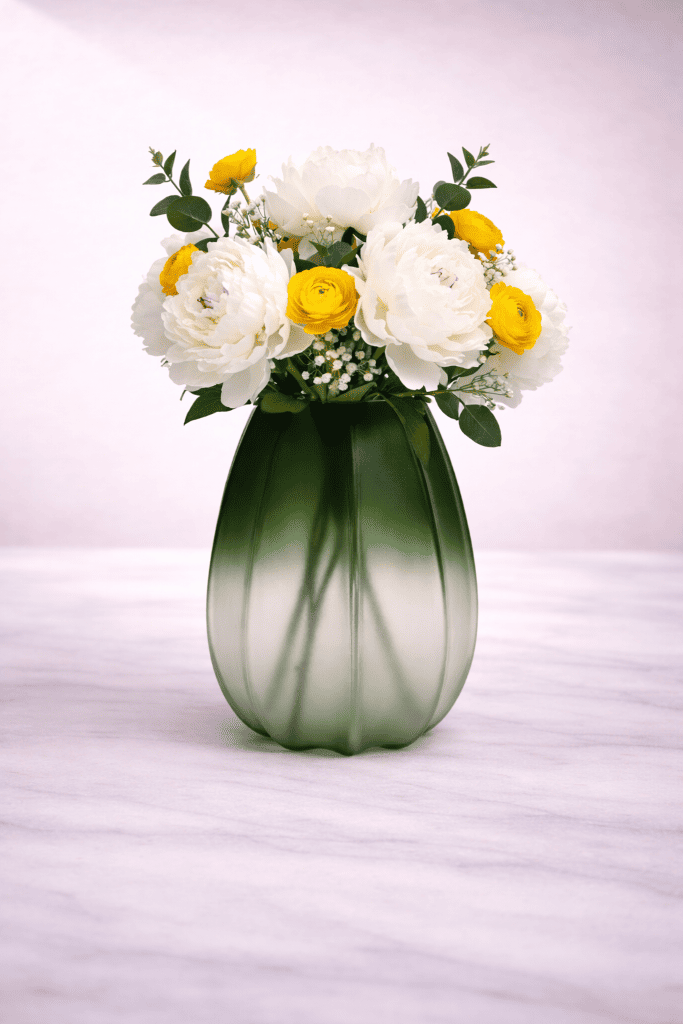 Crafted from high-quality premium glass, the vase features a unique petal-inspired shape with subtle vertical panels, giving it a modern sculptural look. The wide body provides stability while the slightly narrowed opening helps hold flower arrangements beautifully.
