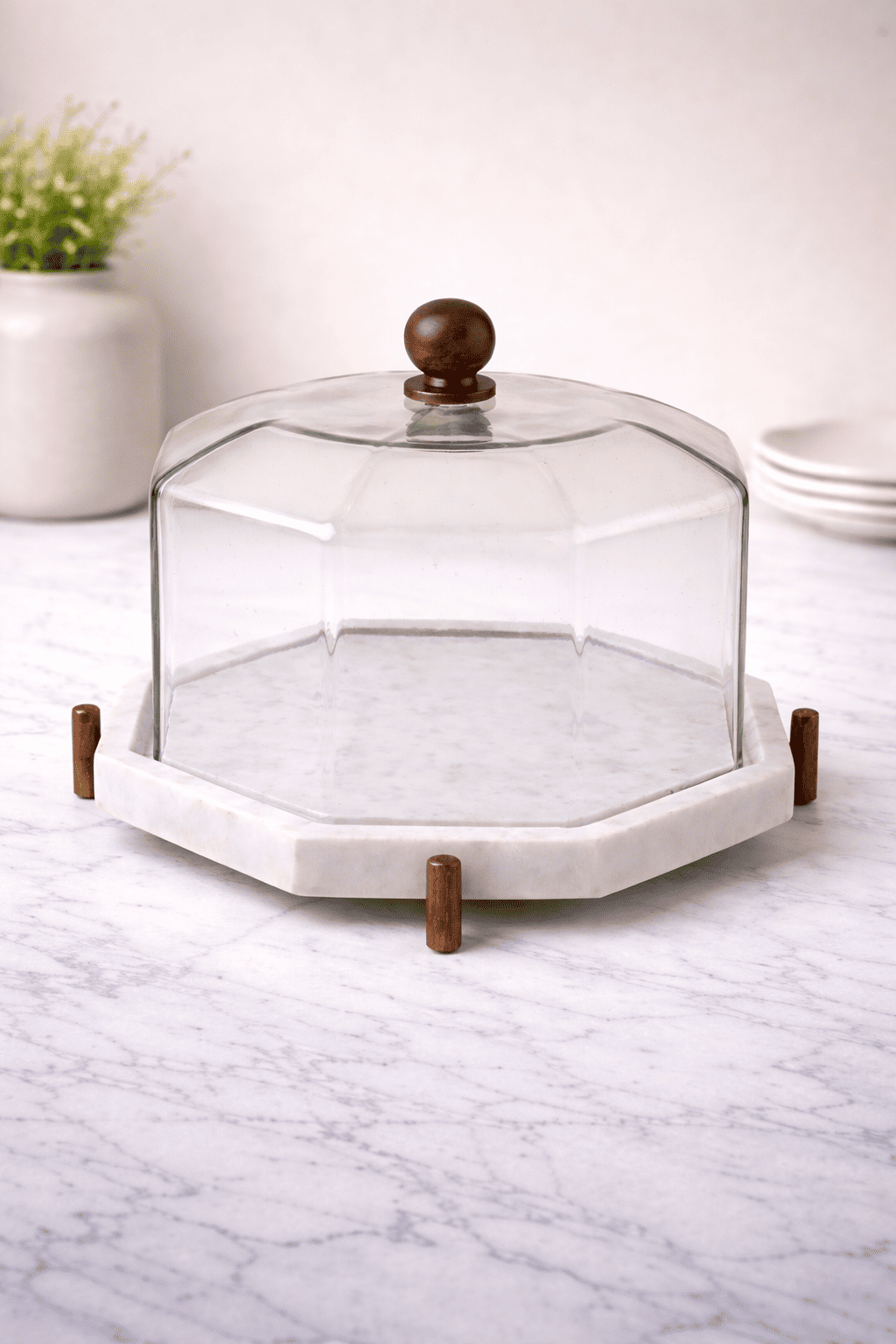 The Hexagon Marble Glass Display Dome by The Castle Crafts is a sophisticated serving and display piece crafted to enhance the presentation of desserts, pastries, and gourmet treats. Featuring a unique hexagonal clear glass dome placed on a premium white marble base with elegant wooden accents, this piece blends modern geometry with natural materials. The transparent glass cover keeps food protected while the marble base adds a luxurious touch, making it perfect for dessert tables, coffee tables, bakeries, and stylish home décor.