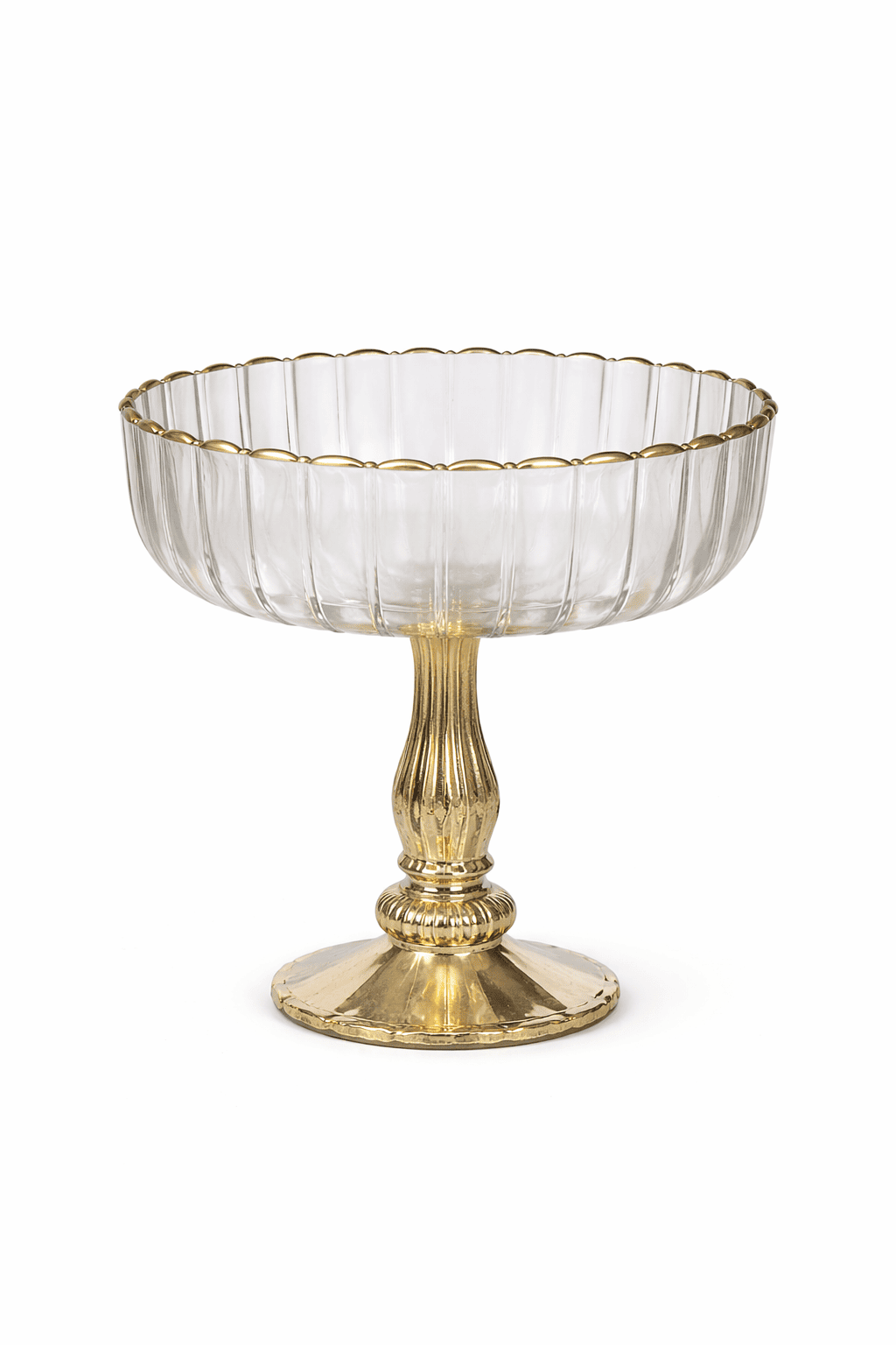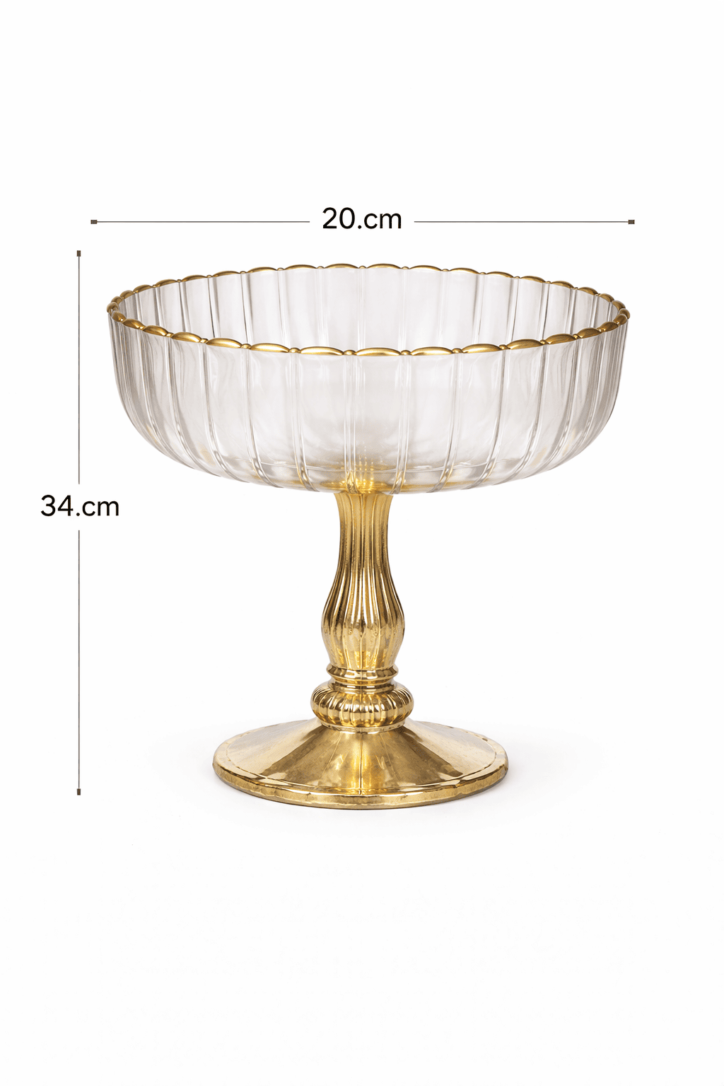 The Castle Crafts Premium Glass Decorative Bowl with Gold Stand is a grand and luxurious centerpiece designed to elevate any décor setting. Featuring a wide 20 cm diameter bowl crafted from high-quality clear ribbed glass and supported by a tall 34 cm gold metallic pedestal base, this piece creates a royal and eye-catching presence. Perfect for floral arrangements, dry fruits, sweets, floating candles, or luxury hamper styling, it is ideal for weddings, festive decorations, hotel displays, and premium home interiors.