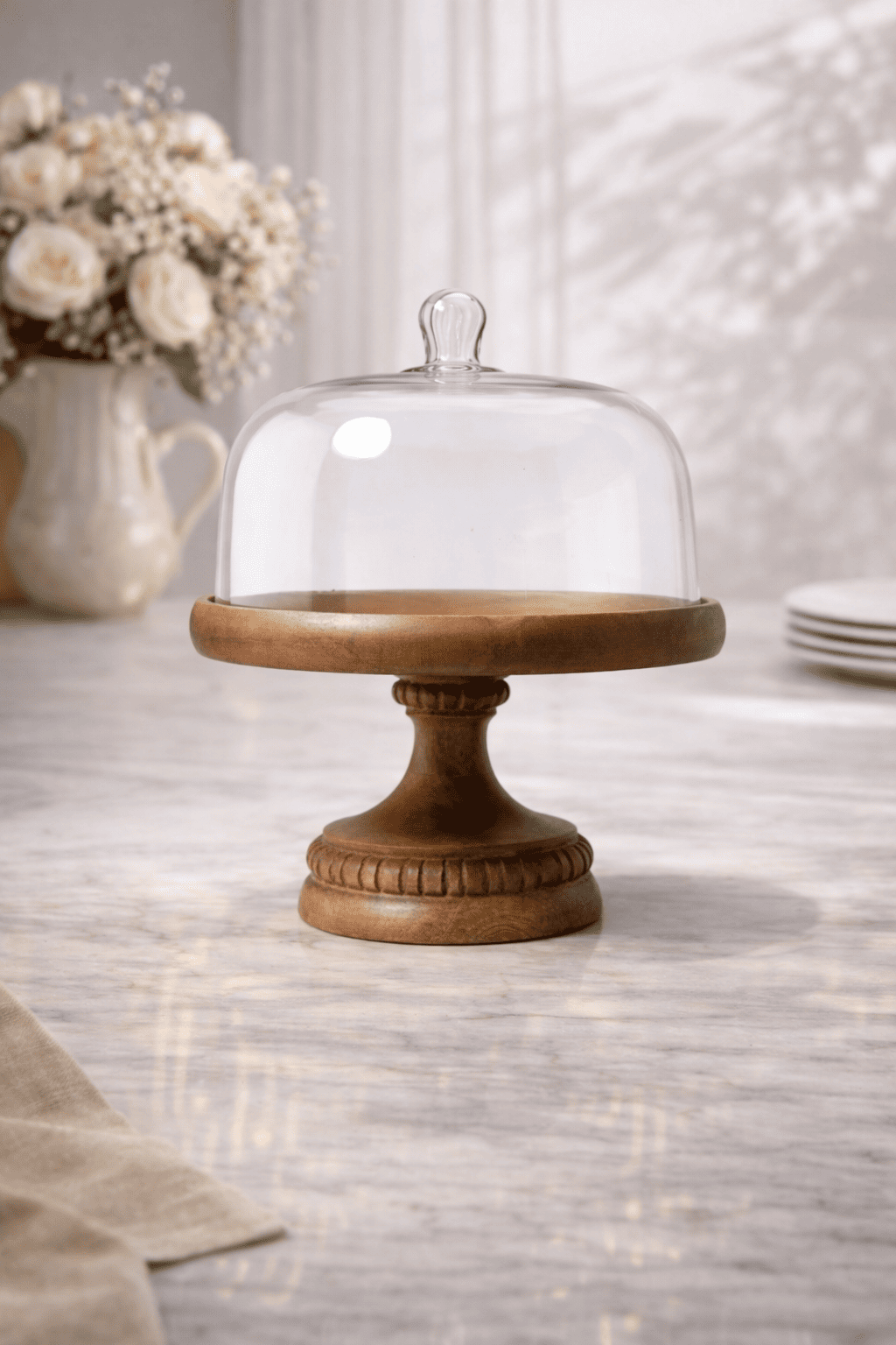 The Pedestal Cake Dome by The Castle Crafts is a beautifully crafted dessert display designed to add elegance and height to your table presentation. Featuring a crystal-clear glass dome and a finely carved wooden pedestal base, this premium stand showcases cakes, pastries, cupcakes, and desserts in a stylish and sophisticated way. The elevated design makes it perfect for special occasions, bakery displays, parties, and modern kitchen décor while keeping food protected and fresh.