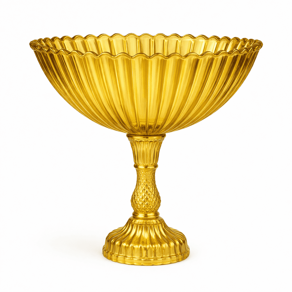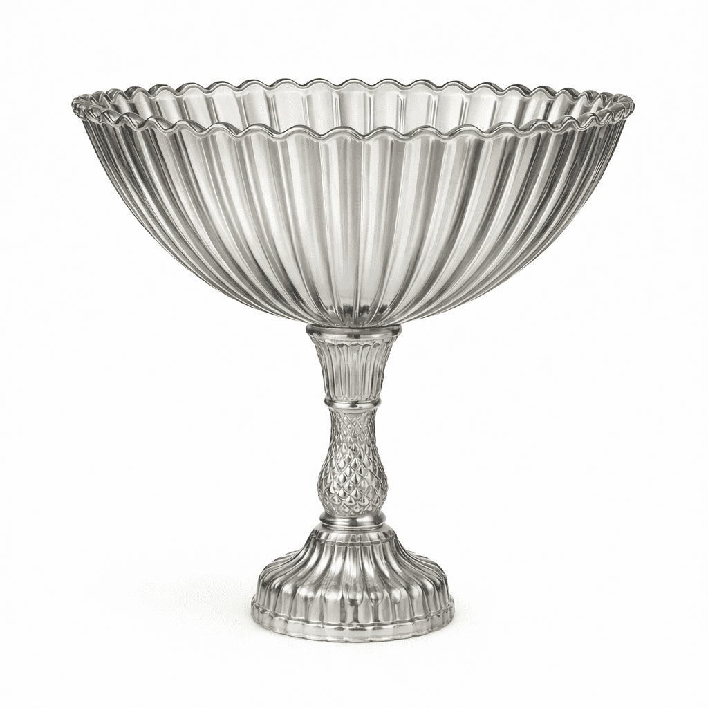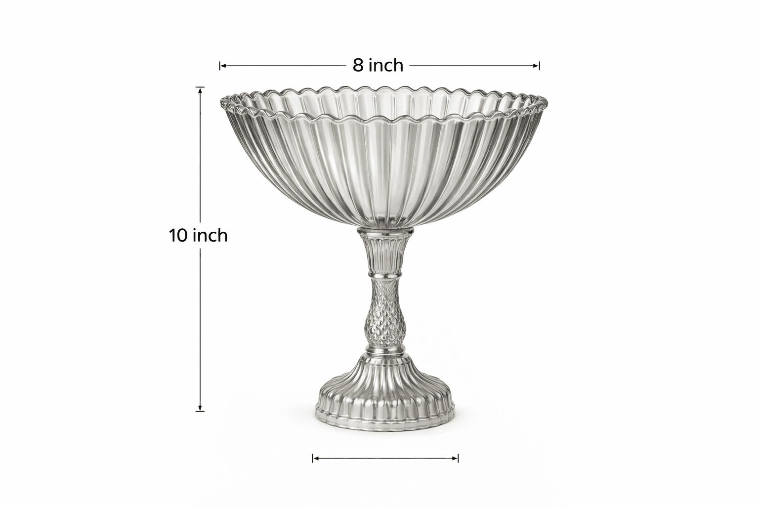 The Castle Crafts Premium Silver Metallic Glass Bowl with Stand is a stunning decorative centerpiece designed to add elegance and sophistication to any space. Crafted from high-quality glass and finished with a rich silver metallic coating, this beautifully ribbed bowl features an 8-inch diameter and stands 10 inches tall, making it perfect for dry fruits, sweets, decorative arrangements, and luxury gift hampers. The detailed pedestal base and classic fluted design enhance its royal appearance, making it ideal for weddings, festive décor, parties, and premium table styling.