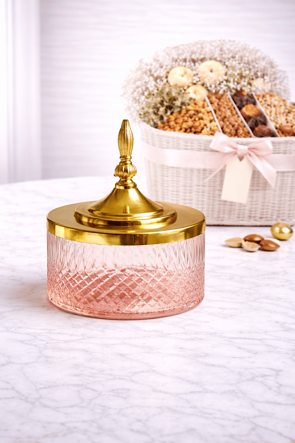 • Premium decorative glass hamper jar with gold lid