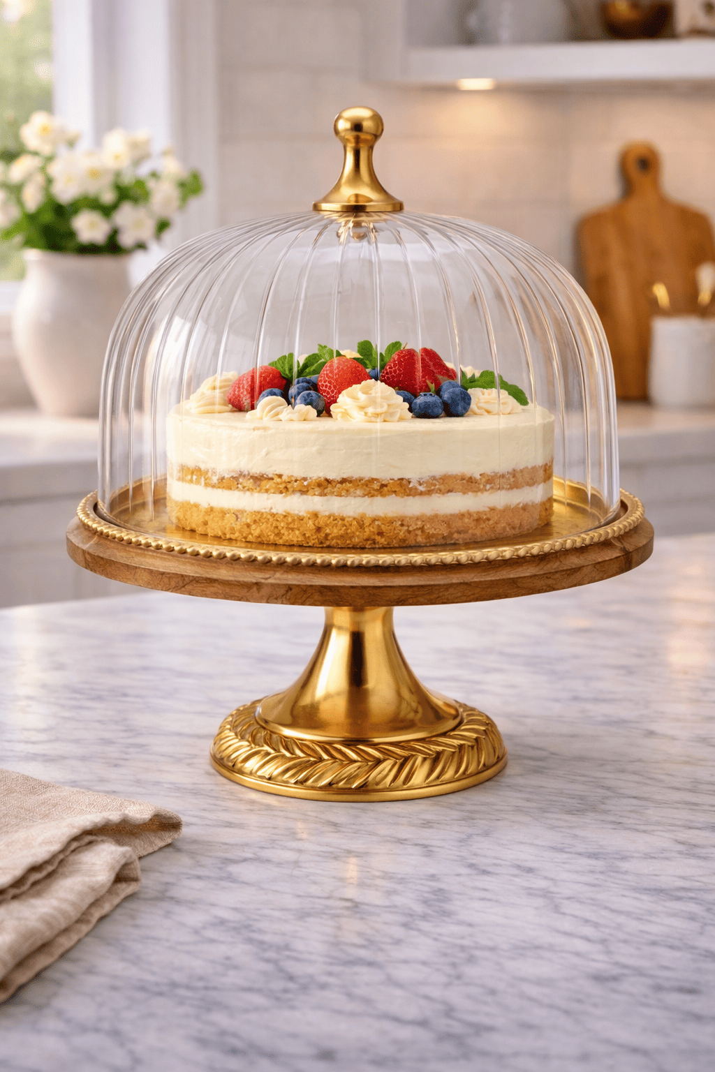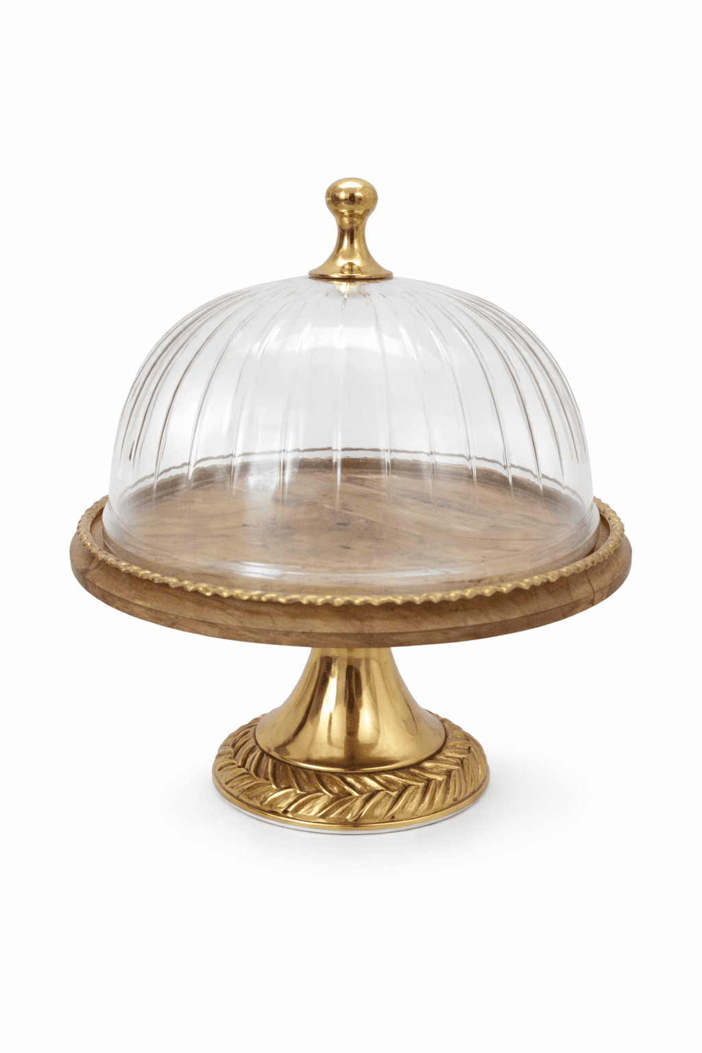 The Royal Gold Ribbed Cake Stand by The Castle Crafts is a luxurious dessert display designed to bring elegance and sophistication to your table. Featuring a beautifully ribbed clear glass dome paired with a premium gold pedestal base and wooden serving platform, this stand creates a stunning presentation for cakes, pastries, and desserts. The decorative gold detailing and elevated pedestal design make it a perfect centerpiece for celebrations, bakeries, cafés, and elegant home dining.