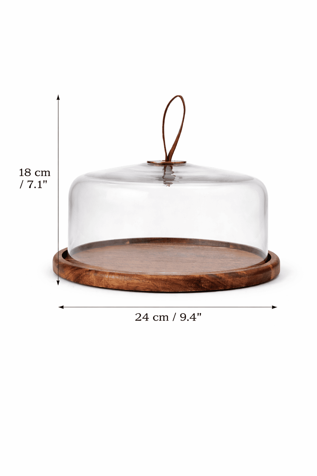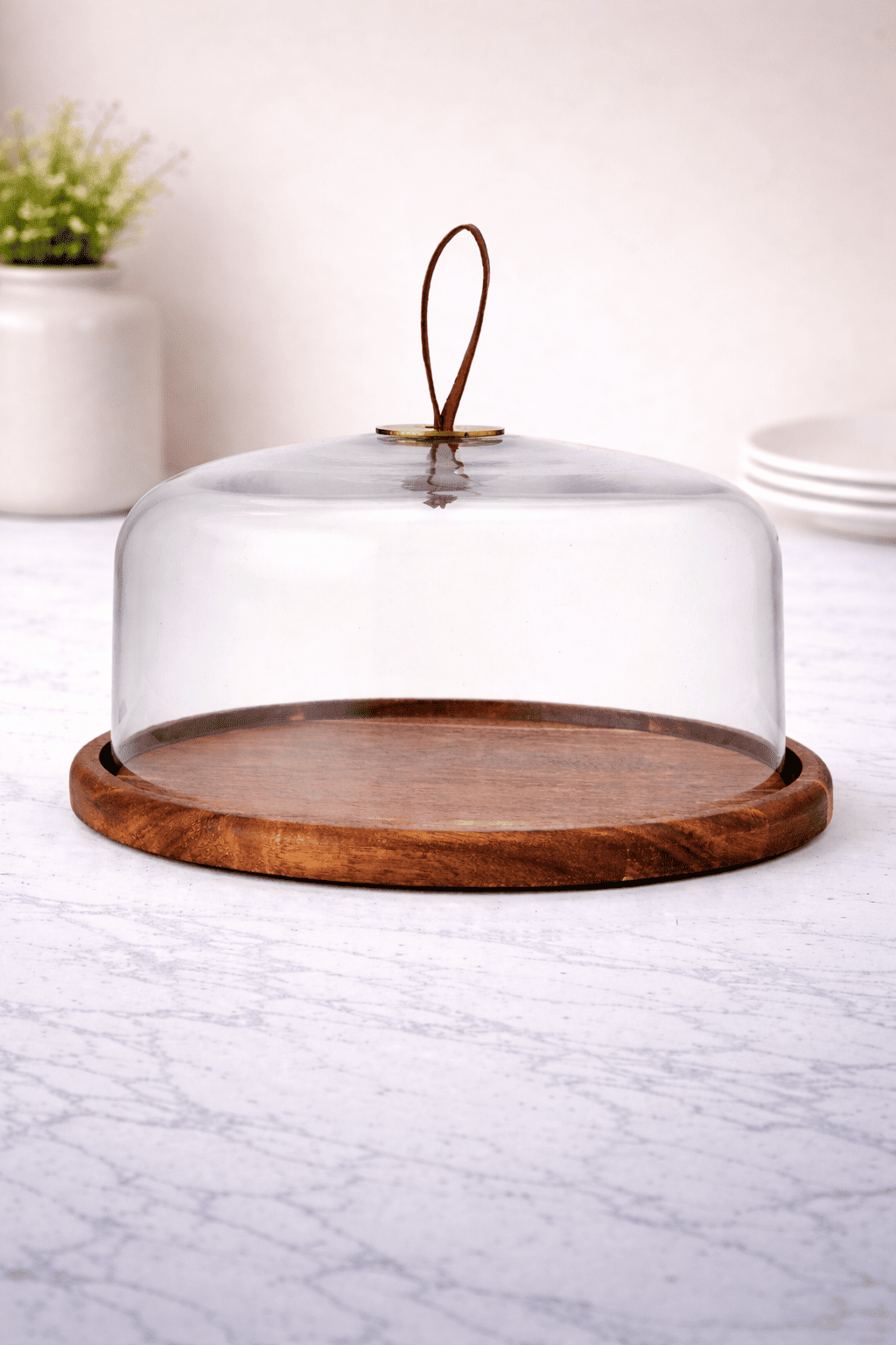 The Rustic Wooden Glass Cake Dome by The Castle Crafts is a stylish serving accessory designed to beautifully display and protect your desserts. Featuring a clear glass dome with a minimalist leather loop handle and a sturdy round wooden base, this piece blends natural rustic charm with modern presentation. Perfect for cakes, pastries, cupcakes, and snacks, the dome keeps food fresh while the wooden base adds warmth and elegance to your table setting.