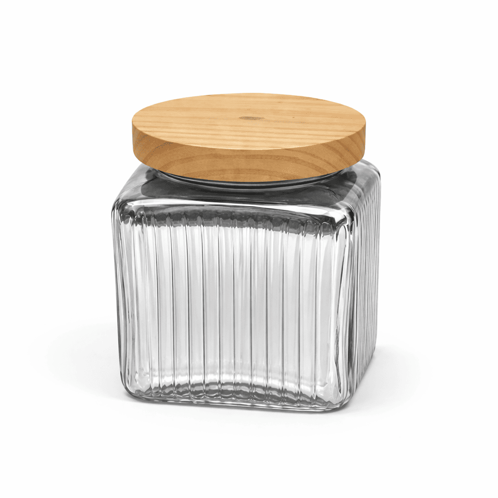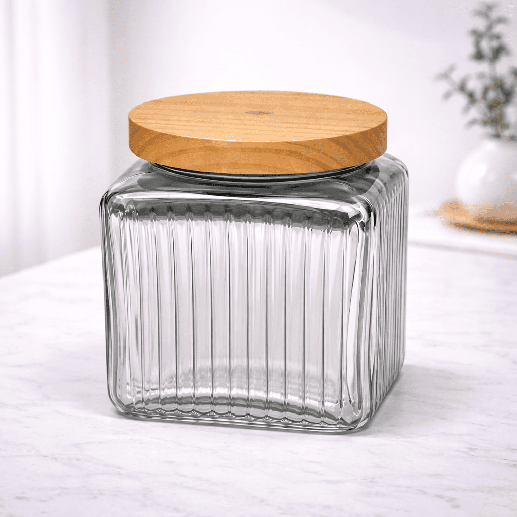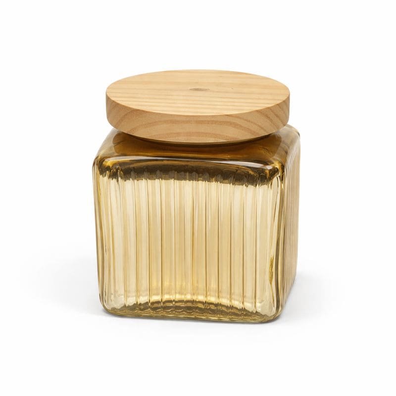• Elegant ribbed glass design with wooden lid