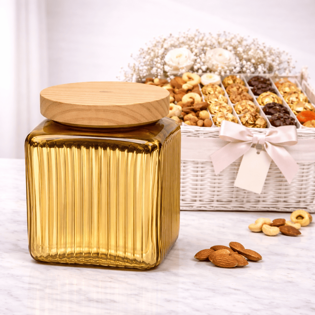 The Square Glass Hamper Storage Jar by The Castle Crafts is a stylish and compact jar designed for gift hampers, dry fruits, chocolates, candies, and festive packaging. Featuring a beautifully ribbed square glass body with a natural wooden lid, this jar offers a modern and elegant look perfect for luxury hamper presentations.