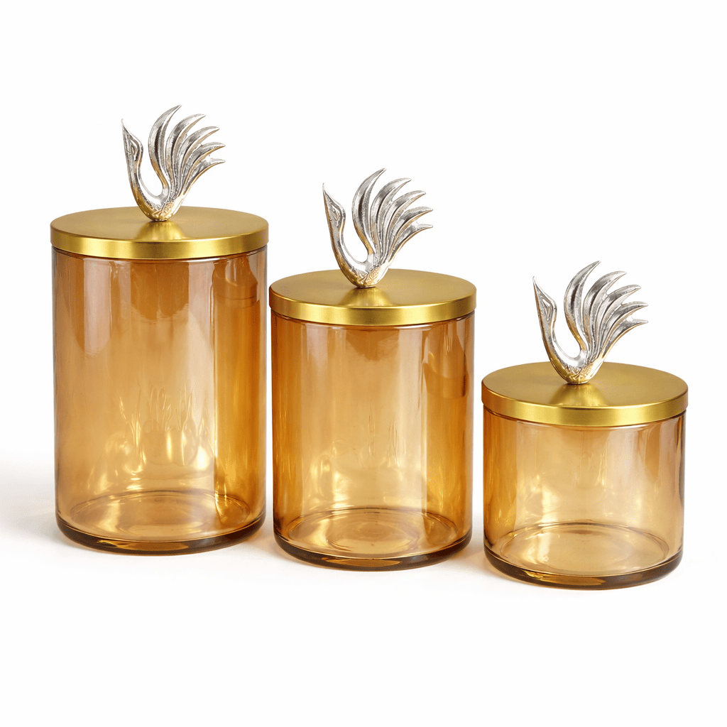 The Swan Lid Glass Hamper Jar by The Castle Crafts is a stylish and elegant container designed specially for luxury gift hampers and festive packaging. This beautifully crafted jar features a transparent amber glass body with a premium gold lid topped with a decorative swan design, giving it a sophisticated and royal appearance.