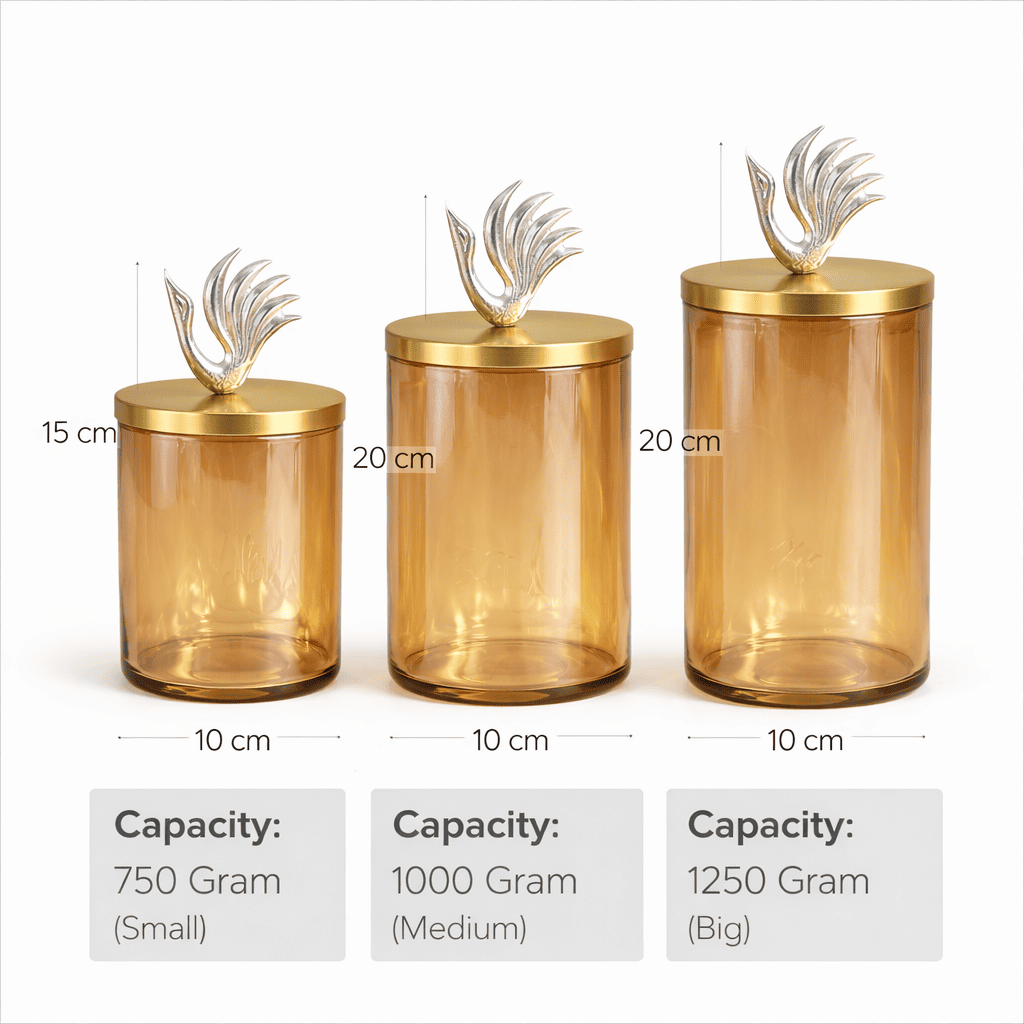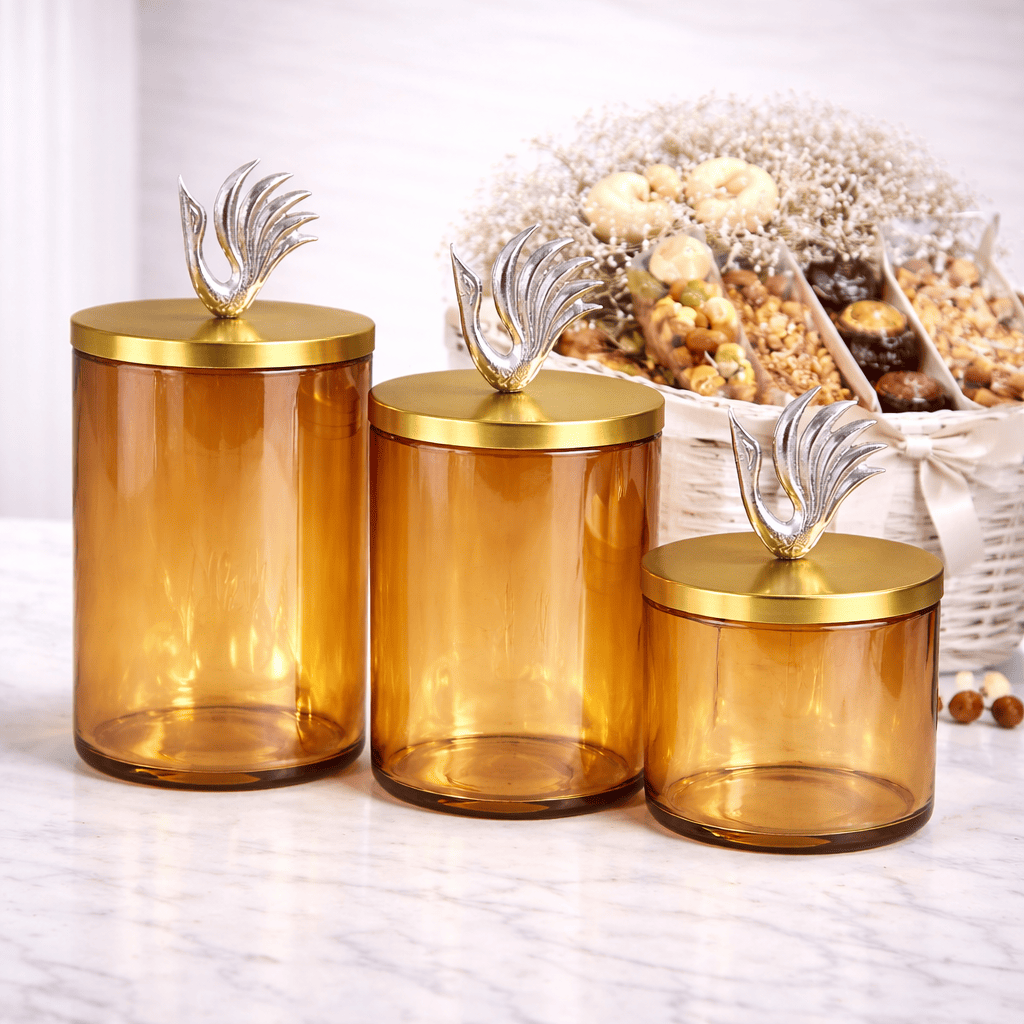 The sleek cylindrical shape makes it perfect for displaying and storing dry fruits, chocolates, candies, cookies, snacks, and festive treats. The swan-shaped lid adds a decorative charm, making the jar an excellent choice for Diwali hampers, wedding hampers, corporate gifting, festive decorations, and premium hamper packaging.