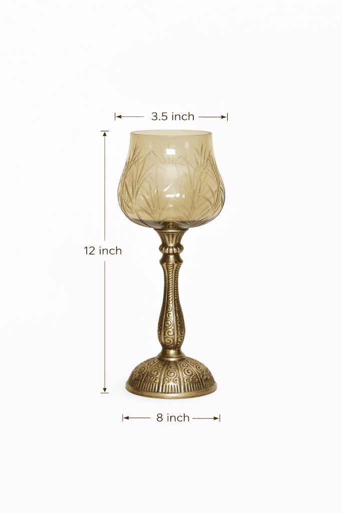 Bring timeless elegance to your décor with this vintage amber glass candle stand. Designed with a beautifully textured amber glass holder and an intricately detailed antique-style pedestal base, this piece reflects classic craftsmanship and luxurious charm. The warm amber glass enhances candlelight beautifully, creating a soft and inviting glow that elevates any decorative setting.