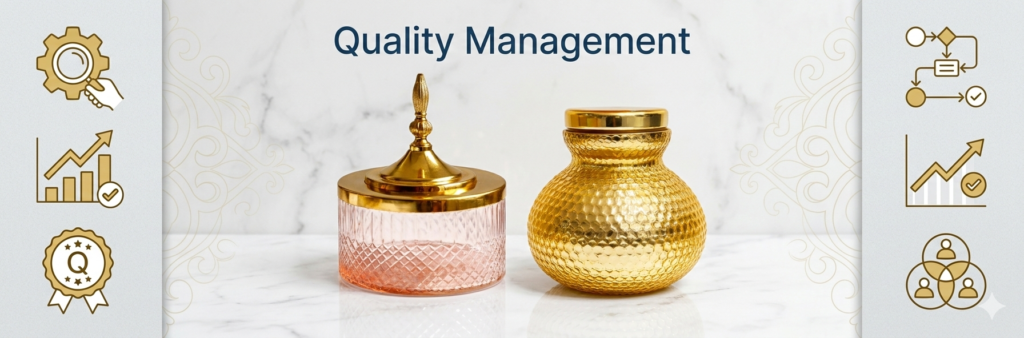 Our quality management system is designed to maintain consistency, durability, premium finishing, and aesthetic perfection in every glass jar, candle holder, and decorative item we manufacture.